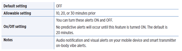 Predictive Alerts use the Low and High Glucose Alert levels to provide an “early” warning. When you have reached the early warning time, the smart transmitter vibrates, and the mobile app gives an audible alert as well as displays a message on the screen. You should immediately perform a finger stick blood glucose test before making a treatment decision.