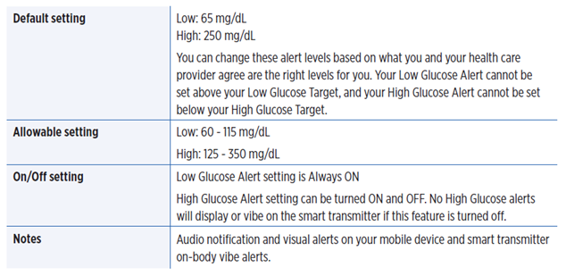 Your Eversense® E3 CGM System will alert you when your glucose levels are outside the alert settings you choose. When you have reached your low and high glucose alert levels, the smart transmitter vibrates, and the mobile app gives an audible alert as well as displays a message on the screen. You should immediately perform a finger stick blood glucose test before making a treatment decision.