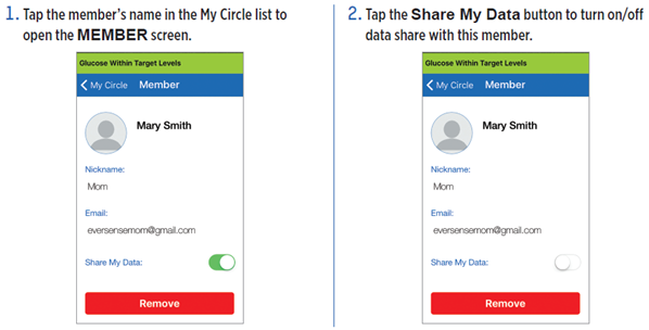 IMPORTANT: If you have disabled the Share My Data feature for a member, that member will not see any of your Eversense® CGM System glucose data, alerts or event history. Members will see your status as Offline on their Eversense® NOW App when you have disabled the Share my Data feature. It can take up to 10 minutes for the change to display on the Eversense® NOW user’s app.