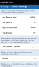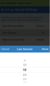 By setting the snooze alert, you can set how often an alert repeats after you have received a Low Glucose and High Glucose alert. The Low Glucose alert repeat interval can be adjusted from 5 minutes up to 30 minutes. The High Glucose alert repeat interval can be adjusted from 15 minutes up to 180 minutes.